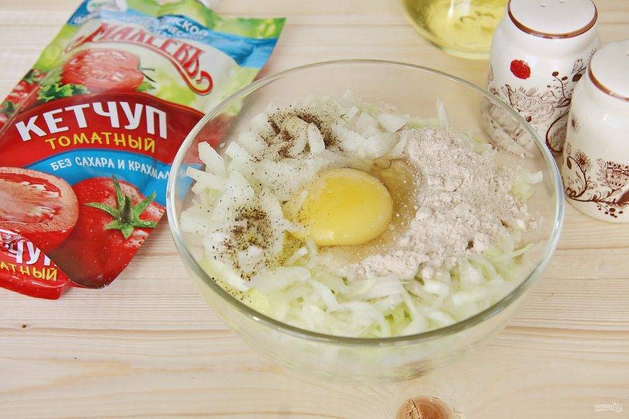 Добавьте яйцо, амарантовую муку (можно заменить на любую другую), нарезанную мелкими кубиками луковицу, соль и перец по вкусу. Можно добавить любимые специи.