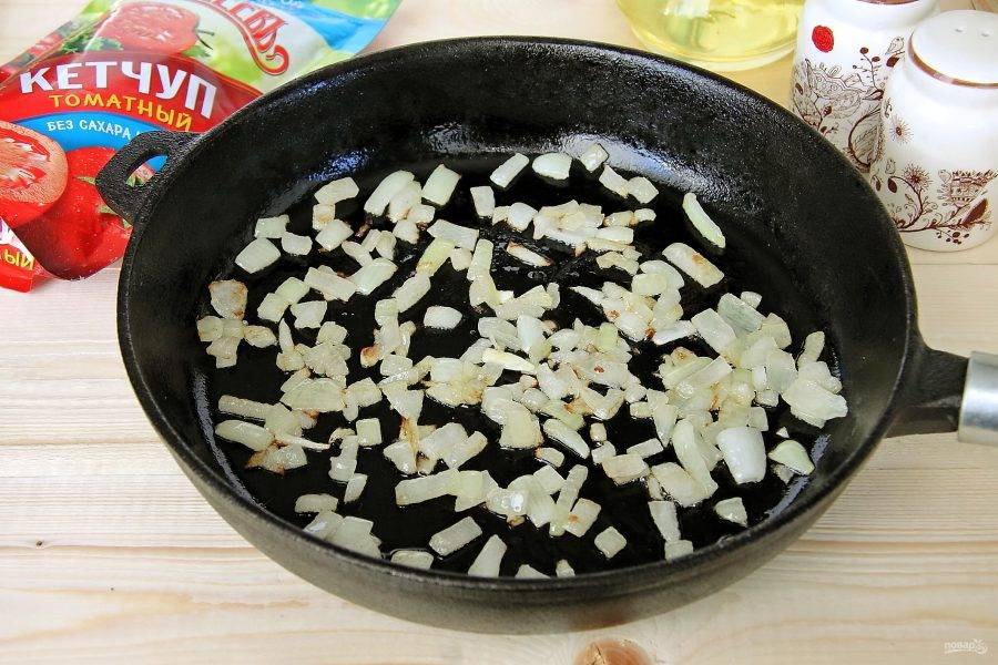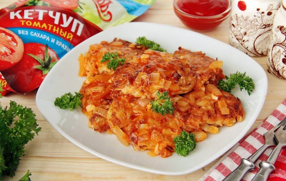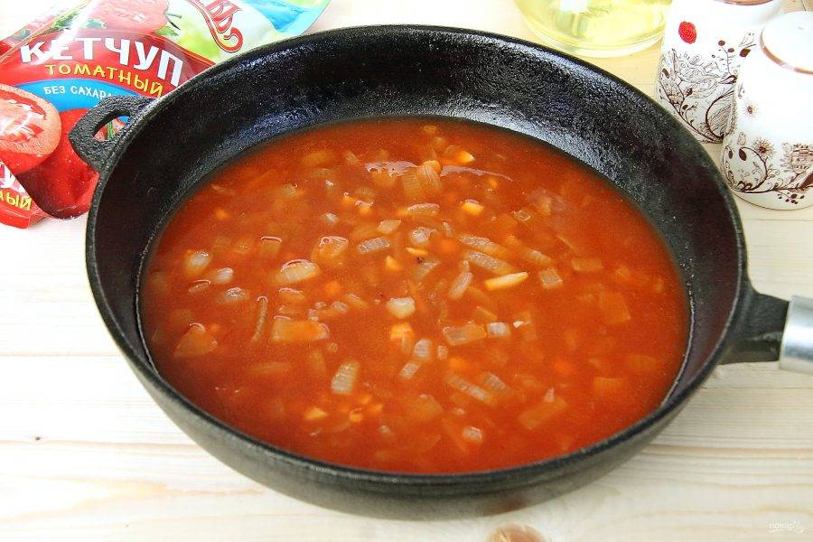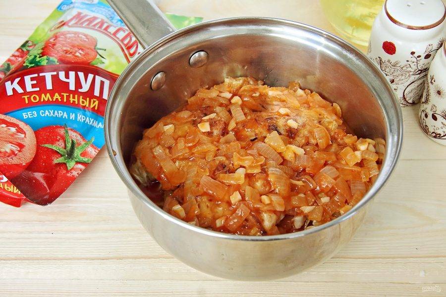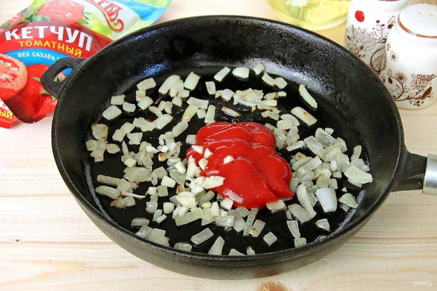 Добавьте измельченный ножом чеснок и кетчуп. Я использую томатный кетчуп "Махеевъ" без сахара и крахмала.