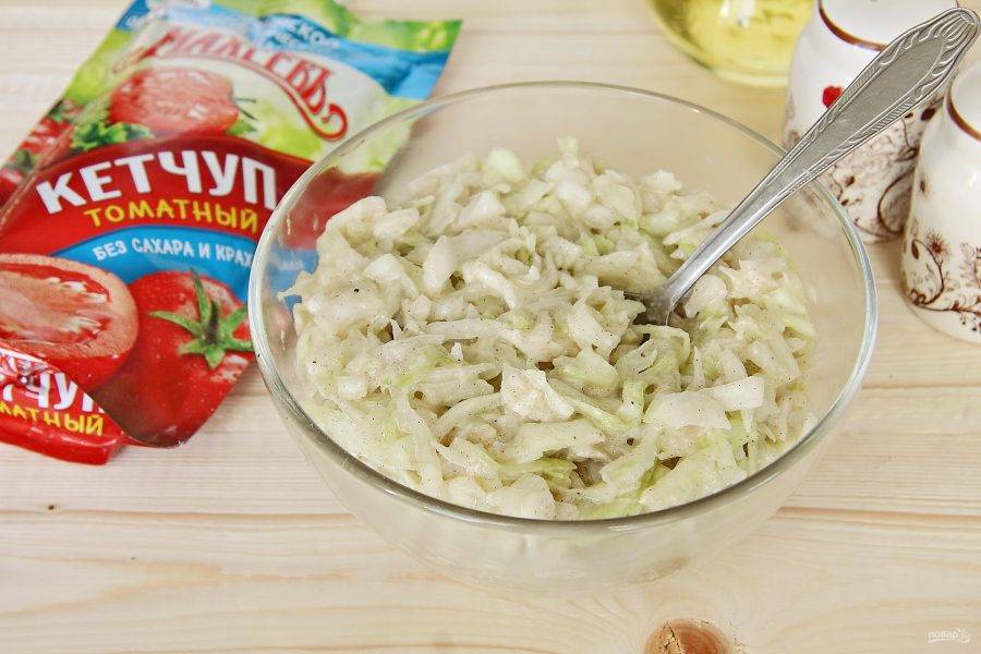 Добавьте к капусте щепотку соли и помните руками, чтобы она стала мягче и пустила сок.