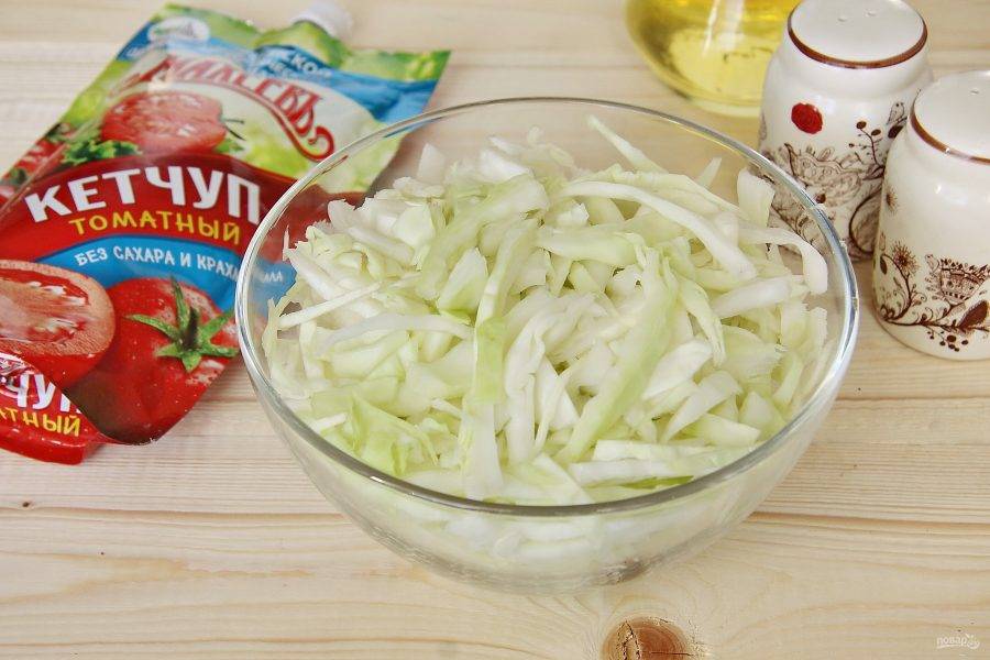 Капусту тонко нашинкуйте и сложите в глубокую миску.