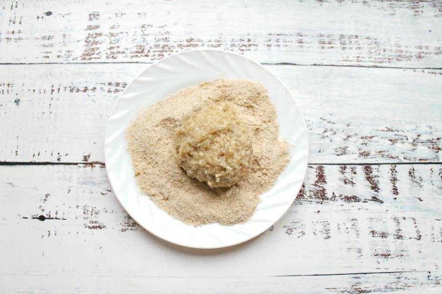 Рыбный фарш отбейте до уплотнения и сформируйте круглые котлетки. Запанируйте их в панировочных сухарях.