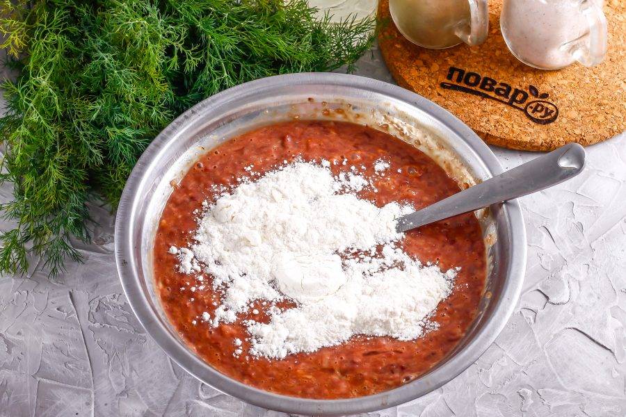 Всыпьте пшеничную муку высшего сорта и вмешайте ее в массу.