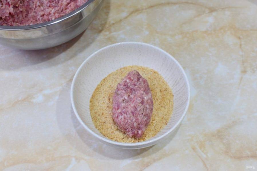 Сформируйте небольшие котлеты и обваляйте их в панировочных сухарях.
