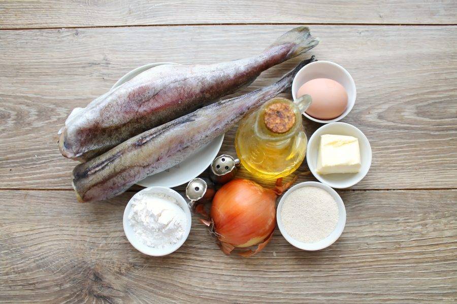 Подготовьте все необходимые ингредиенты для приготовления котлет из минтая и трески.