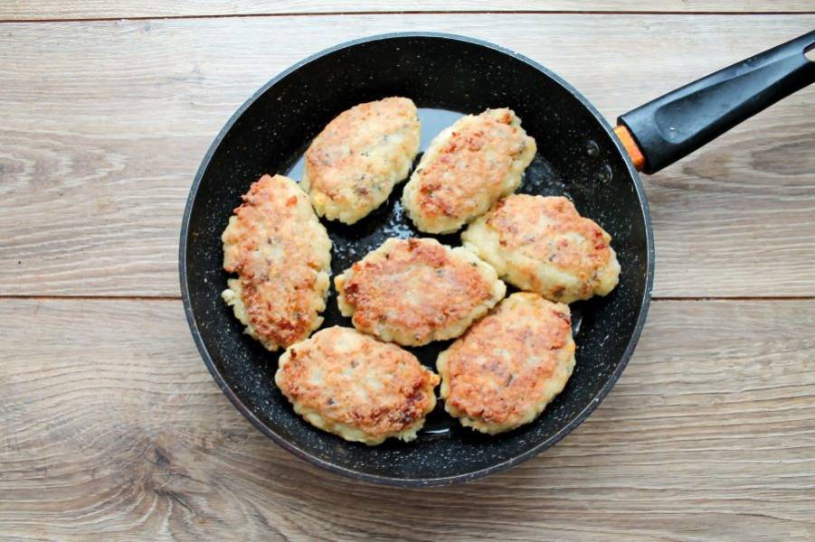 В сковороде разогрейте растительное масло и обжаривайте рыбные котлеты с двух сторон до румяной корочки на медленном огне под крышкой. Примерно по 7-10 минут с каждой стороны.