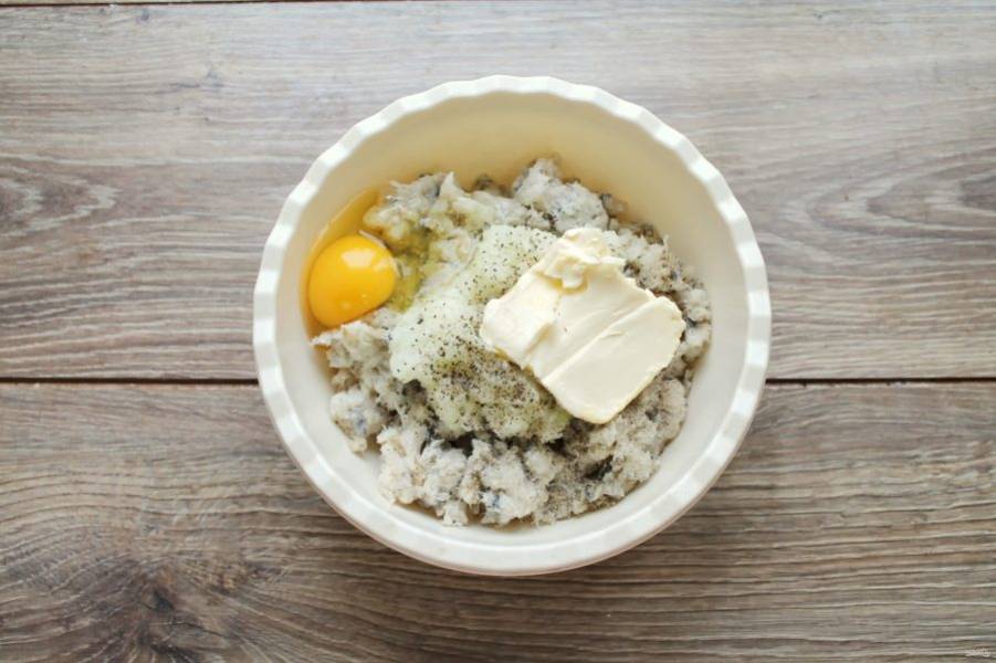 В миску с фаршем разбейте яйцо и добавьте мягкое сливочное масло. Все посолите, поперчите и хорошо перемешайте.
