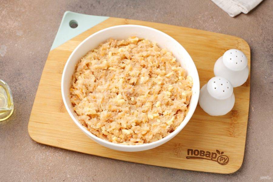 Добавьте к фаршу тёртый на крупной тёрке сыр, яйцо, соль и молотый перец по вкусу.