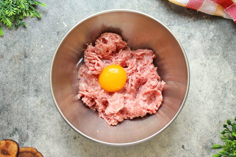 Мясной фарш выложите в миску и вбейте яйцо.