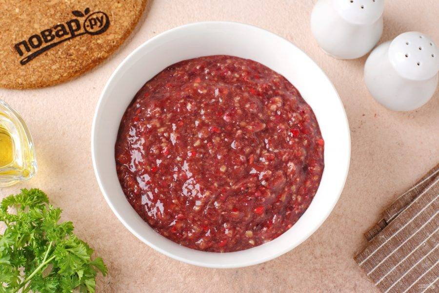 Все подготовленные компоненты перекрутите через мясорубку и перемешайте.