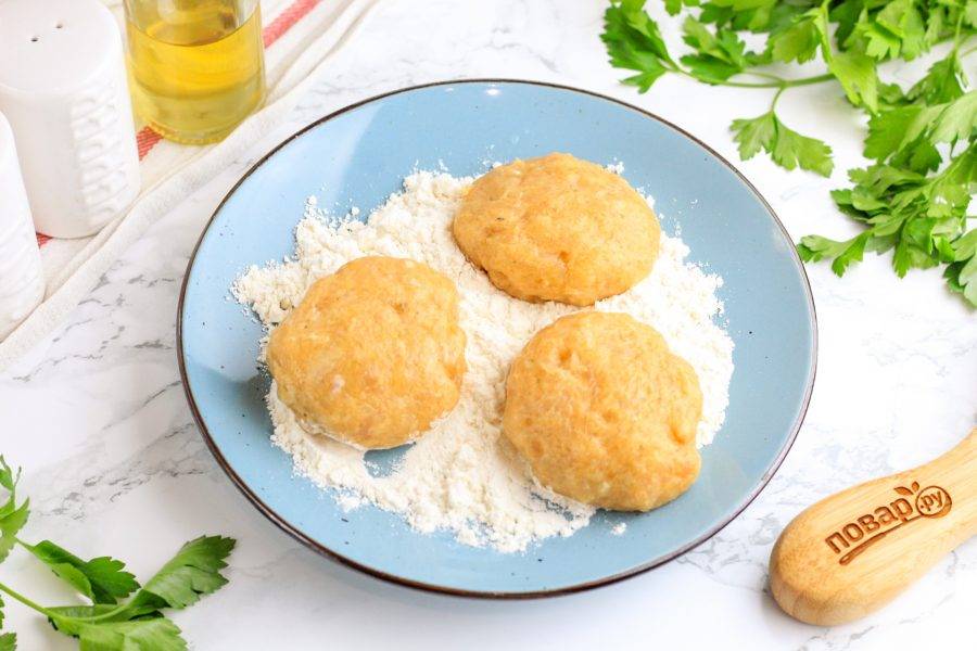 Оставшуюся муку высыпьте на тарелку. Разогрейте на сковороде растительное масло и убавьте нагрев до умеренного. Из котлетной массы сформируйте округлые заготовки и обпанируйте в муке.