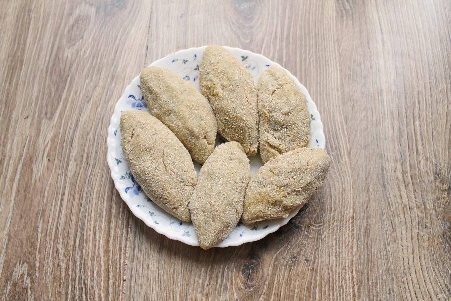 Влажными руками сформируйте котлеты и выложите их в панировочные сухари.