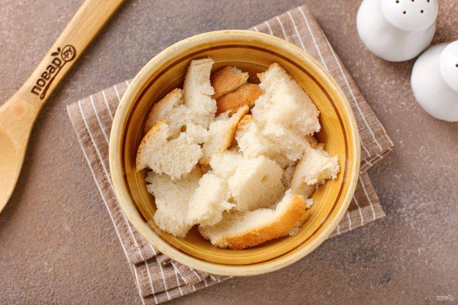 Раскрошите батон руками и замочите в воде.