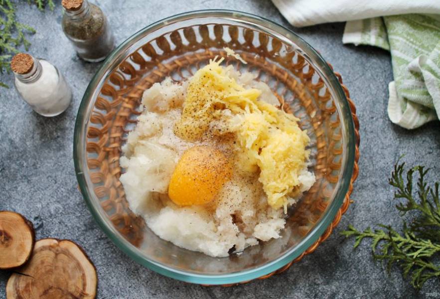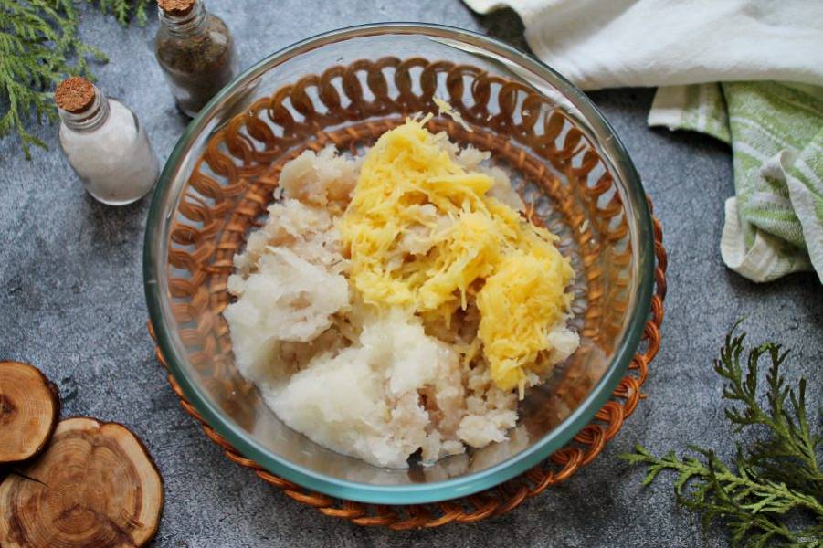 Картофель почистите, натрите на мелкой терке, отожмите и добавьте к рыбному фаршу. Репчатый лук почистите, натрите на крупной терке и добавьте к рыбе и картофелю.