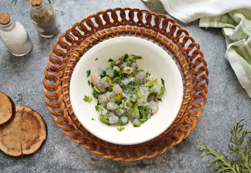 У креветок удалите панцирь, сделайте разрез вдоль спинки и удалите кишку. Порежьте креветки на кусочки, посолите и смешайте со сливочным маслом, рубленым чесноком и зеленью, лучше всего с петрушкой.