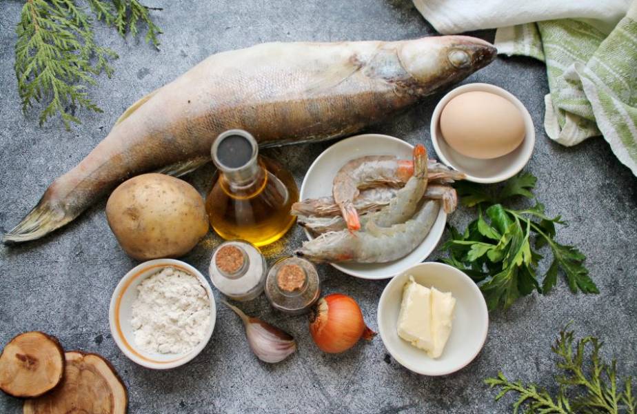 Подготовьте все необходимые ингредиенты для приготовления котлет из судака и креветок.