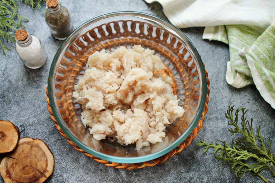 Судака очистите от чешуи, внутренностей, удалите голову и сделайте из него филе. Удалите кожу, кости и прокрутите дважды через мясорубку с мелкой решеткой.