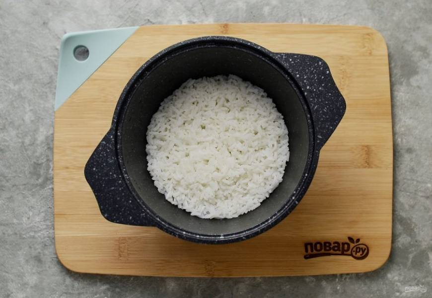 Рис промойте до прозрачности, залейте водой так, чтобы она покрывала рис на 1 см. выше. Доведите до кипения, затем убавьте температуру до минимума и варите 20 минут под крышкой.