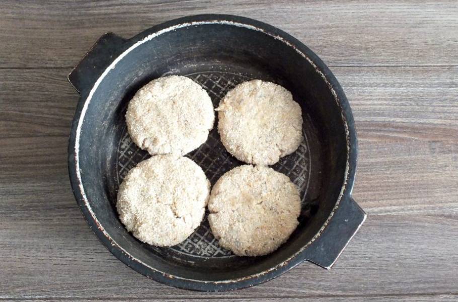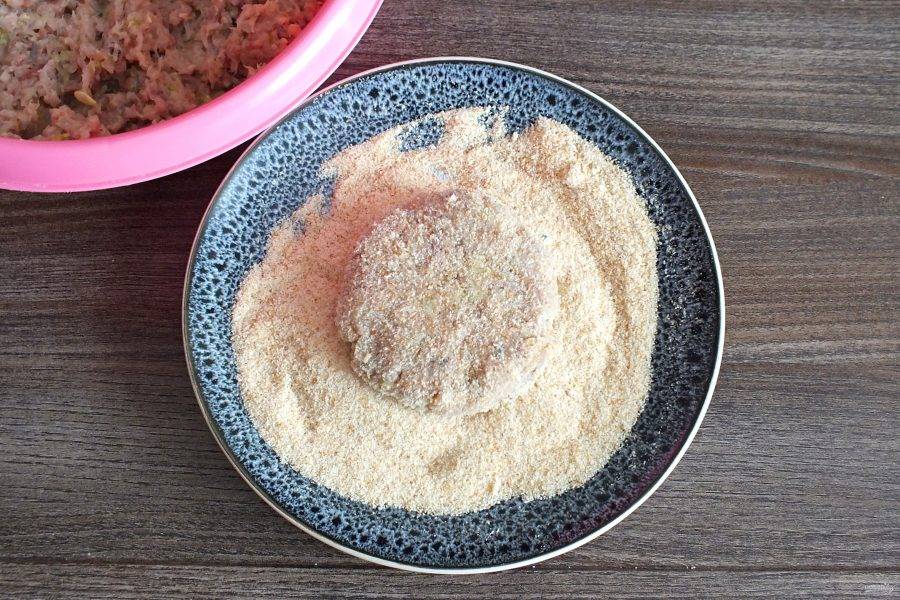 В тарелку насыпьте панировочные сухари. Фарш поделите на равные части и сформуйте котлеты. Каждую котлету обваляйте в панировочных сухарях.