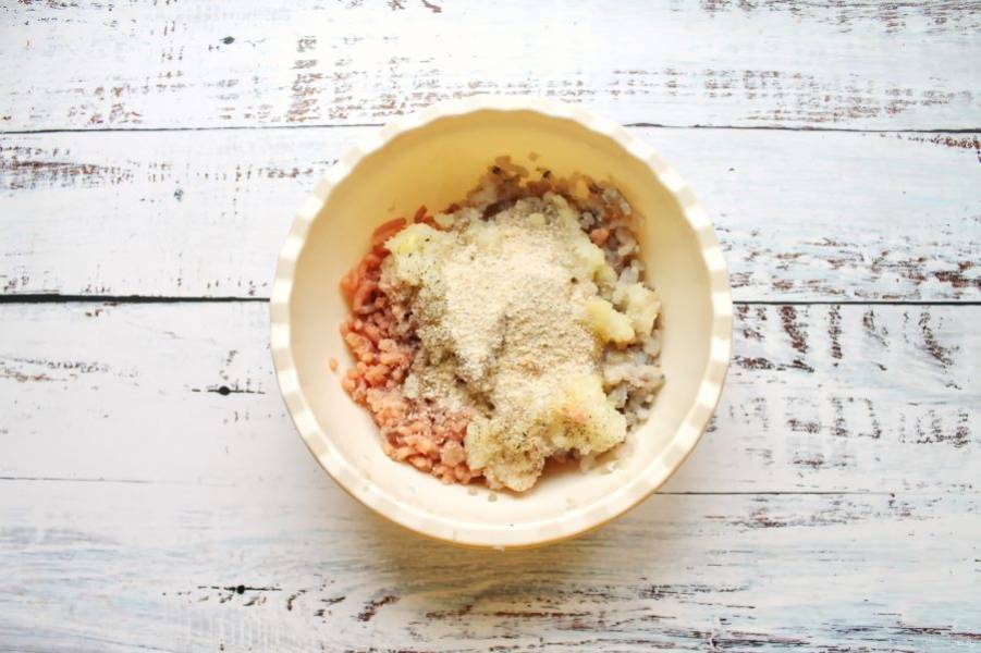 Добавьте в рыбный фарш яйцо, посолите и поперчите.