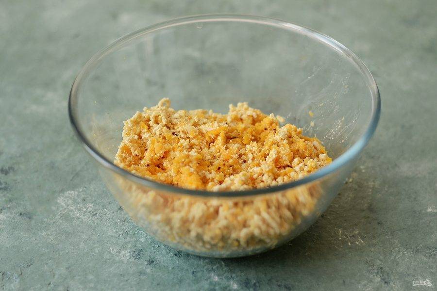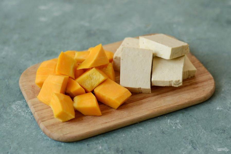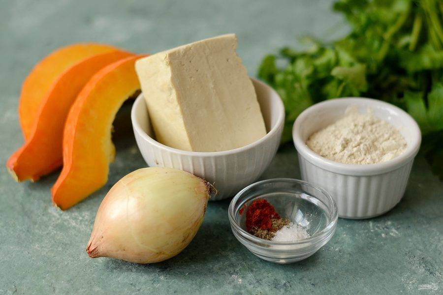 Прокрутите в мясорубке тофу, тыкву и жареный лук до консистенции фарша.