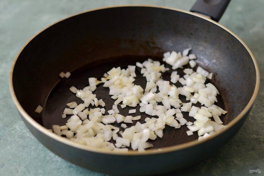 Лук нарежьте кубиками, обжарьте в сковороде до золотистого цвета.