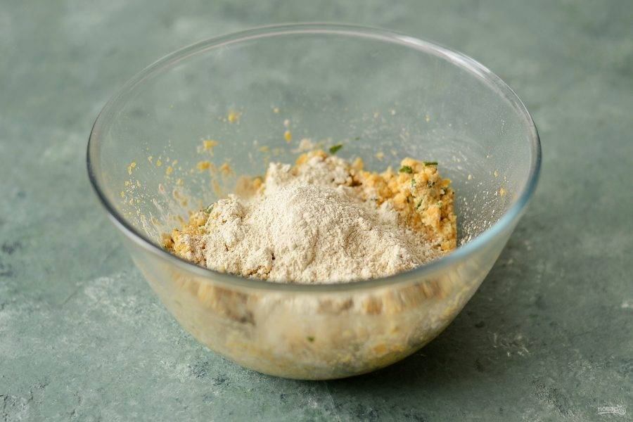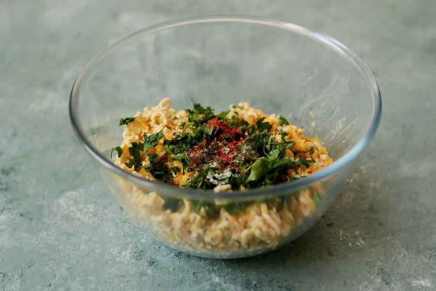 Добавьте мелко порубленную петрушку, специи, соль и перец. Перемешайте.