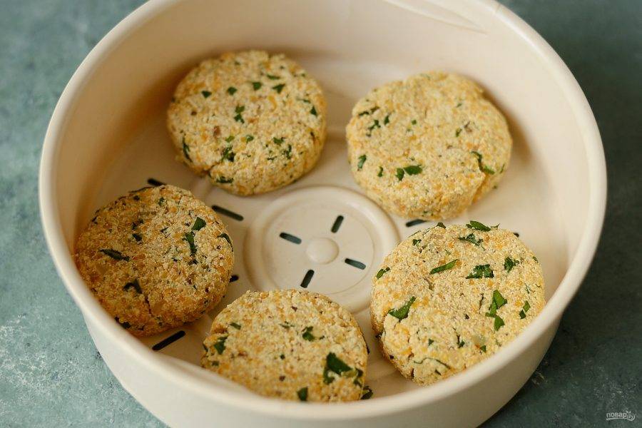 Слепите из получившегося фарша котлетки. Готовьте их на пару 30 минут.