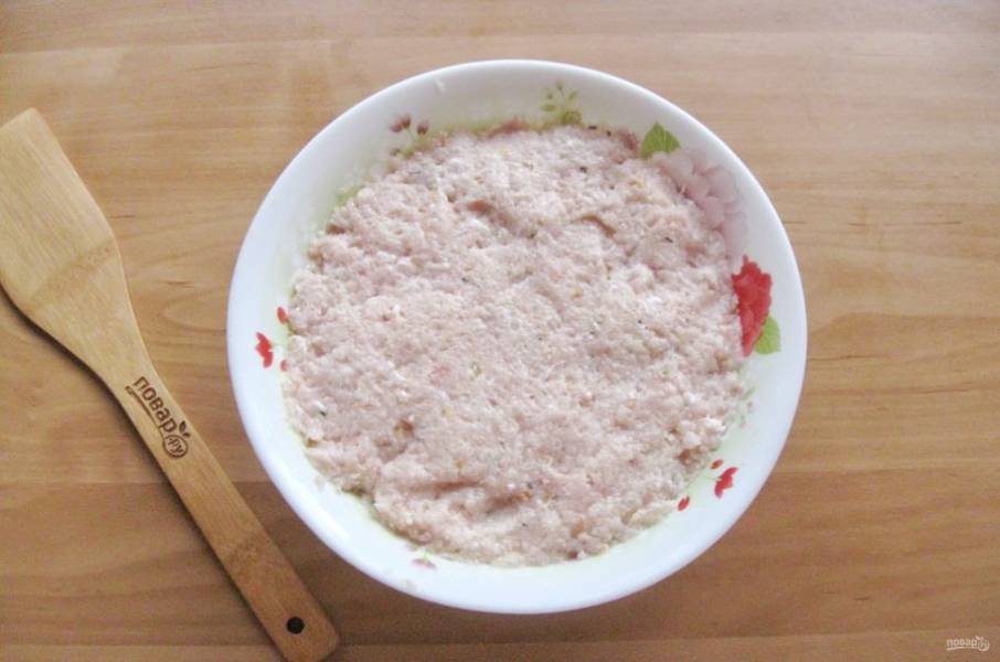 Тщательно перемешайте фарш до однородной, вязкой консистенции.
