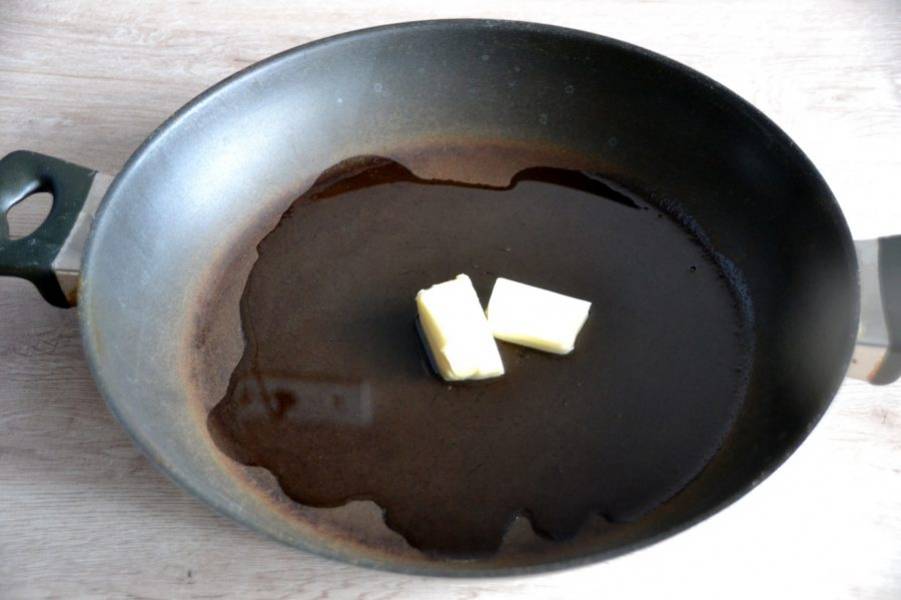 Разогрейте сковороду, влейте на нее растительное масло, добавьте кусочек сливочного масла, прогрейте.
