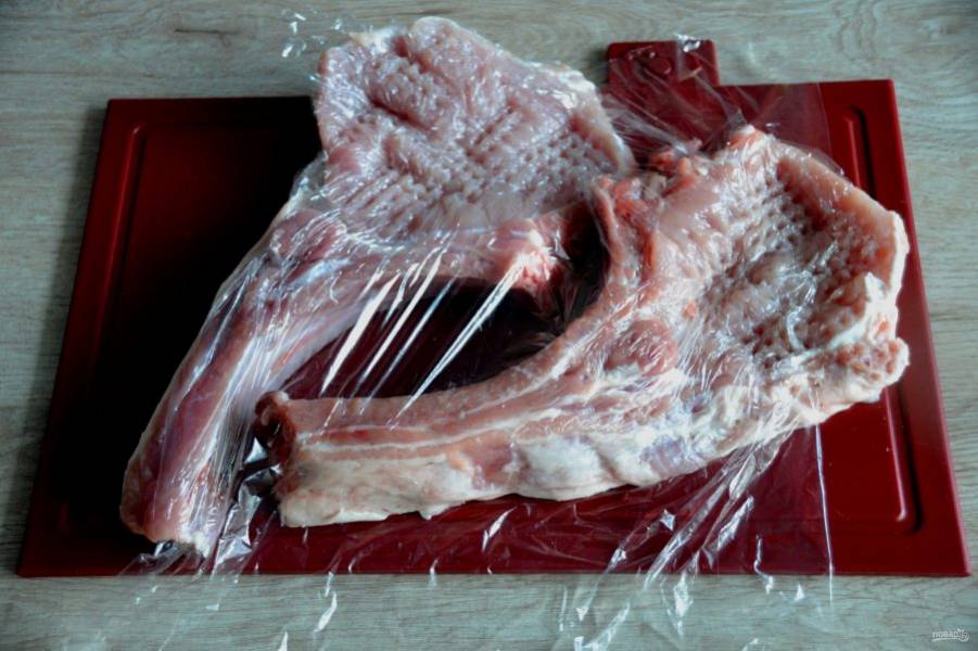 Накройте мясо пищевой пленкой, отбейте.