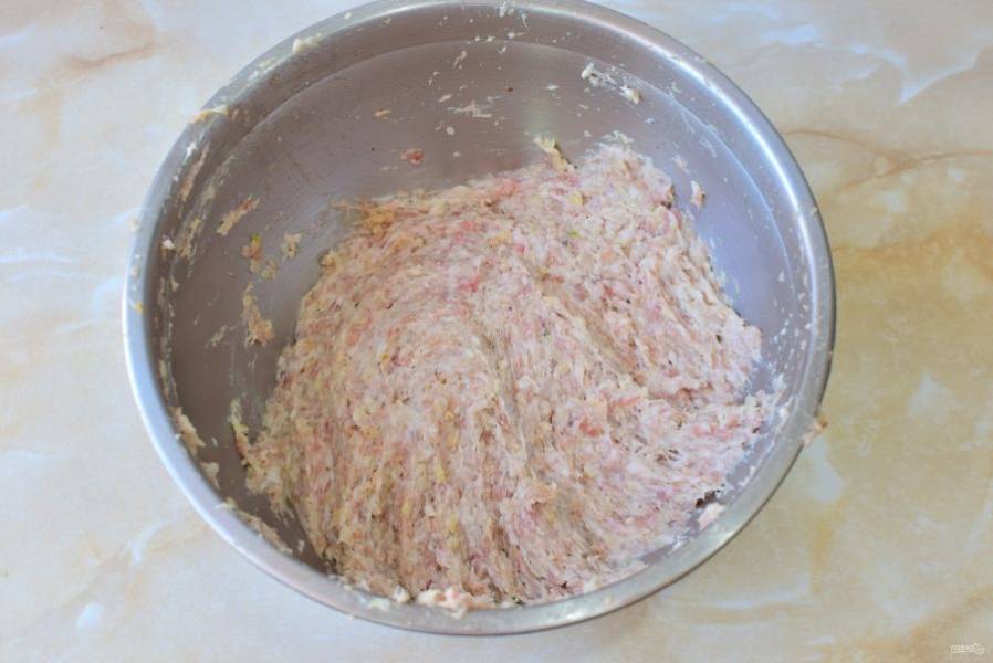 По вкусу добавьте соль и специи. Все ингредиенты тщательно перемешайте между собой. Мясную массу отбейте о дно чаши, чтобы сделать её плотнее. Благодаря этому котлеты будут лучше держать форму при приготовлении.