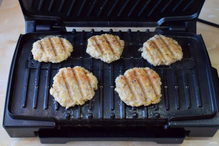 Закройте крышку и готовьте котлеты 4-6 минут. Постепенно они начнут поджариваться и станут золотистого цвета. Снимите их с гриля.