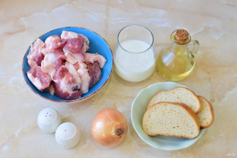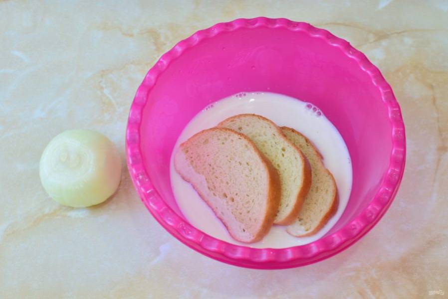 Ломтики батона залейте молоком и оставьте пропитаться. Лук очистите и ополосните в холодной воде.