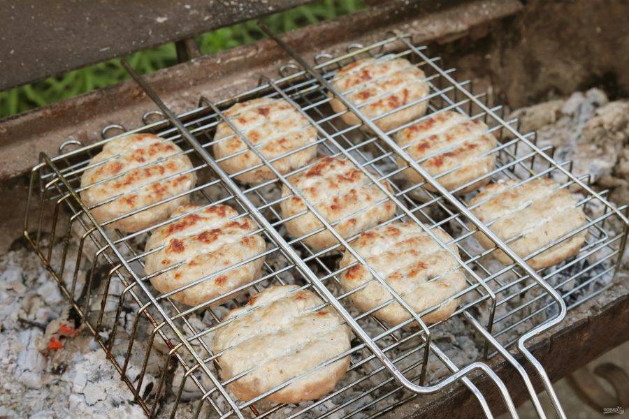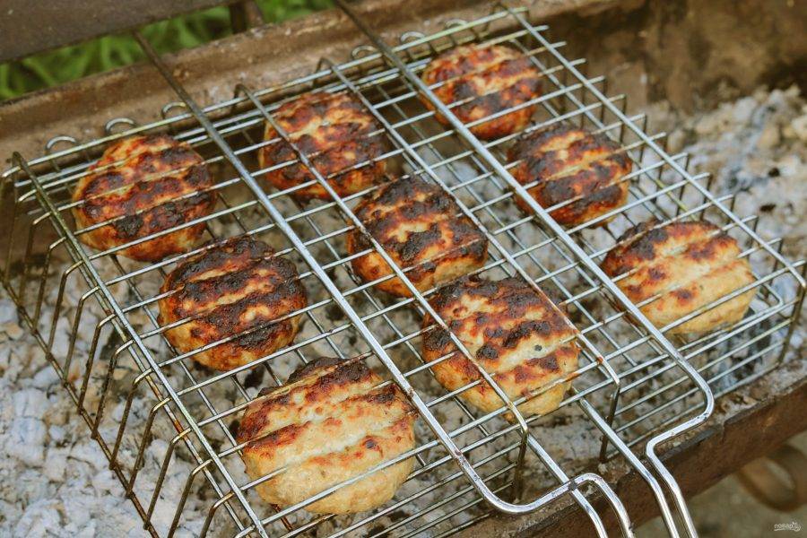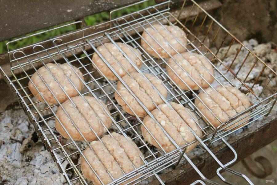 Разожгите дрова и подготовьте жаркие угли. Руки и решётку смажьте растительным маслом. Сформируйте котлеты желаемого размера. Выложите на смазанную решётку.