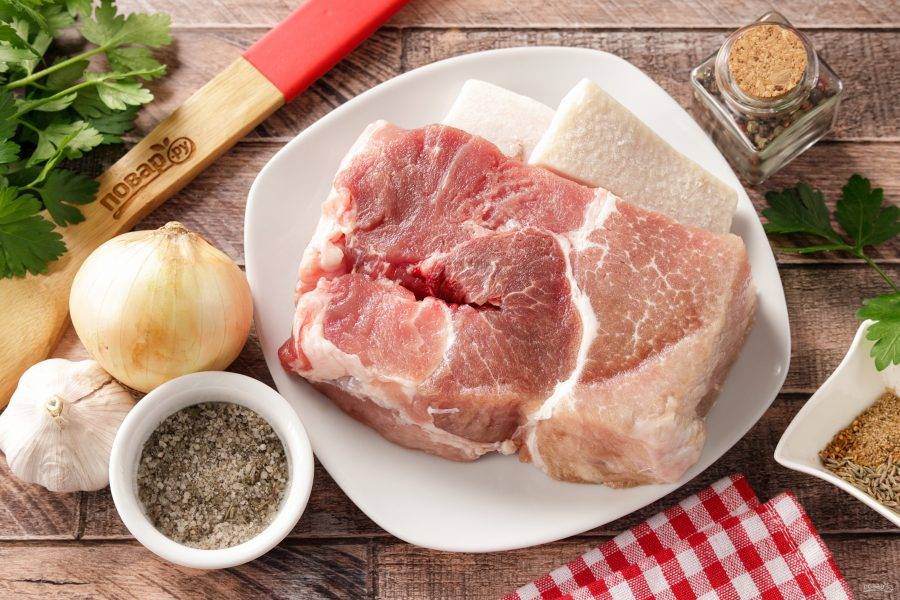 Подготовьте все ингредиенты по списку. Мясо можно взять любое, у меня сегодня свинина. Специи берите на свой вкус, соль я буду использовать адыгейскую.