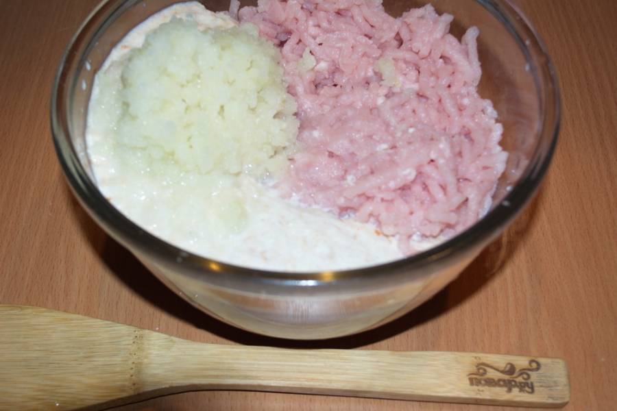 Перекрутите в мясорубке нарезанный белый репчатый лук и 1 картофелину. Добавьте пропущенный через мясорубку замоченный батон. Оставшееся молоко вылейте просто в фарш.