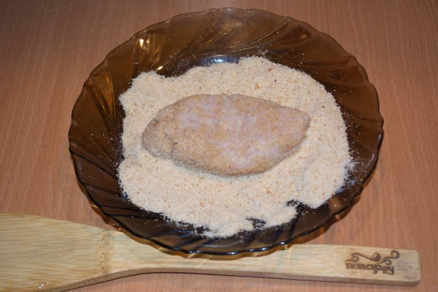 Из полученного фарша сформируйте котлетку. Обваляйте в панировочных сухарях.