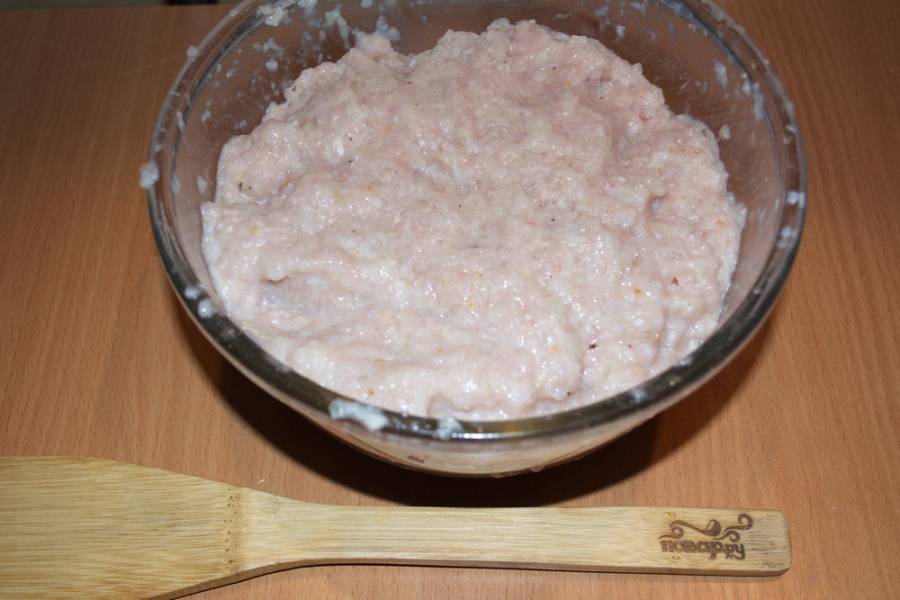 Добавьте в фарш специи, перемешайте. Влейте 0,5 стакана воды и хорошо выбейте фарш.