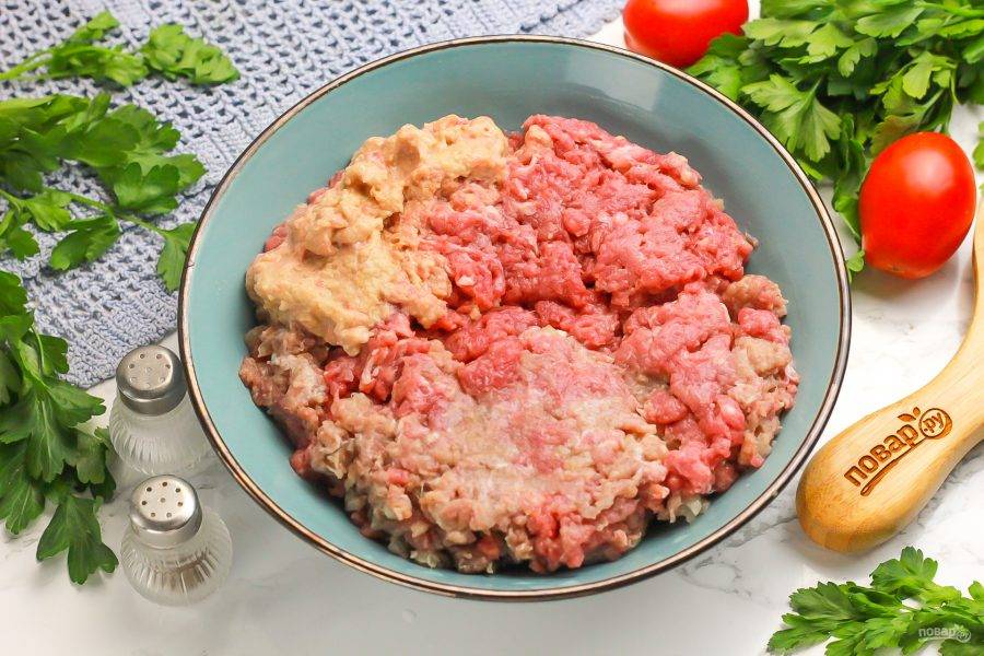 Промойте и измельчите петрушку, мелко нарежьте и добавьте в фарш. Тщательно перемешайте и отбейте фарш, вкидывая его обратно в миску.