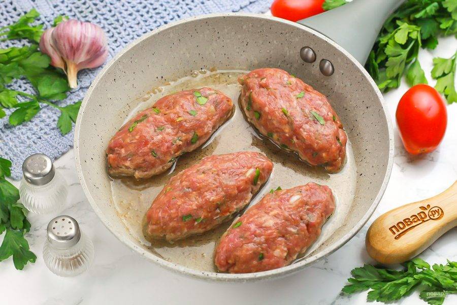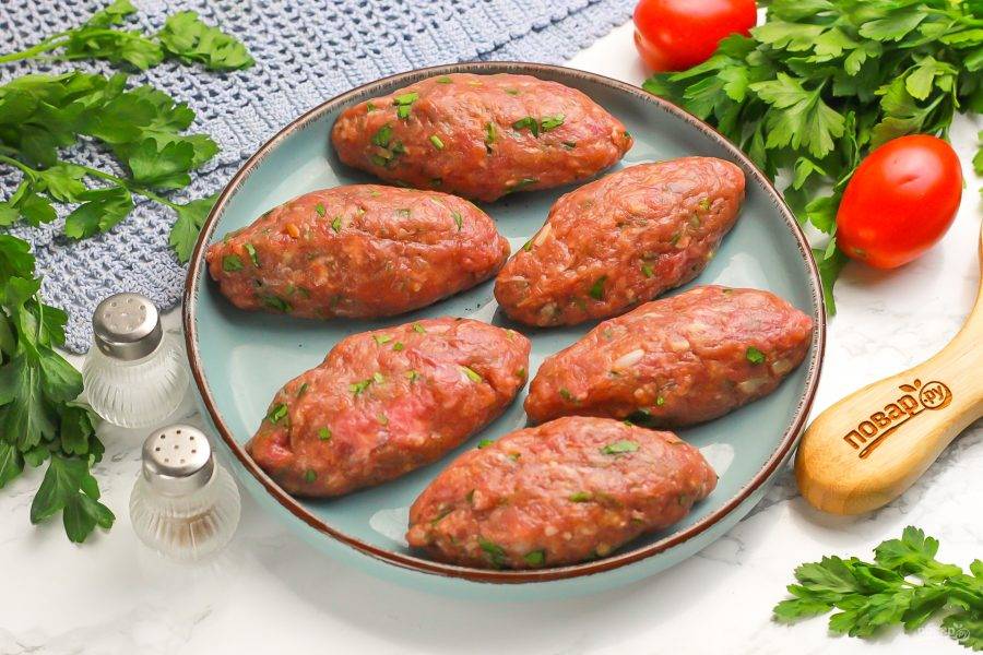 Смочите руки в воде и разделите фарш на равные части. Сформируйте в руках заготовки котлет, округляя их. Котлеты по-турецки должны быть продолговатой формы.