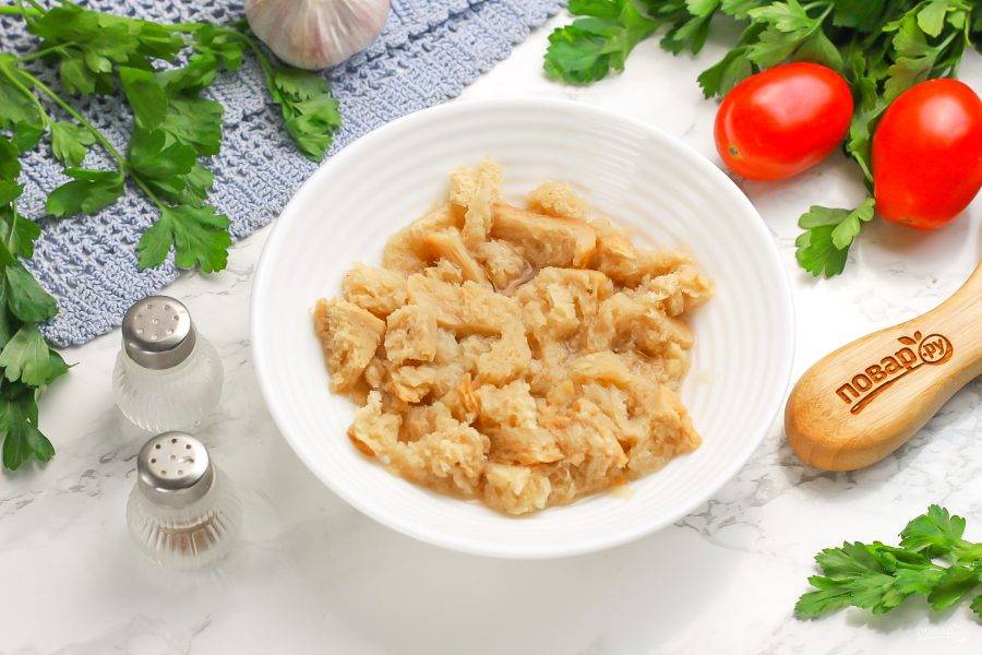 Разломите ломтик ржаного хлеба на части и залейте его водой. Можно залить и молоком. Также сочность фаршу можно придать с помощью добавления свиного сала.