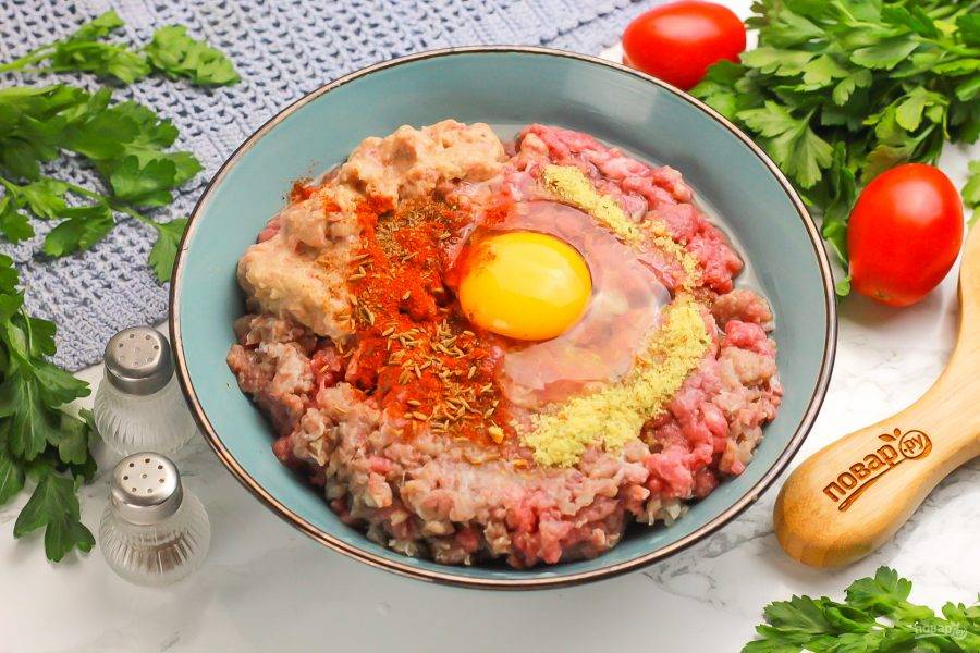 Всыпьте все заявленные специи и пряности, вбейте куриное яйцо и тщательно вымешайте фарш.
