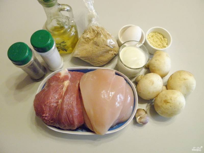 Подготовьте продукты. По мере приготовления я буду уточнять, какие продукты и для чего я использую. Итак, вымойте мясо и грибы, очистите чеснок — и приступаем!