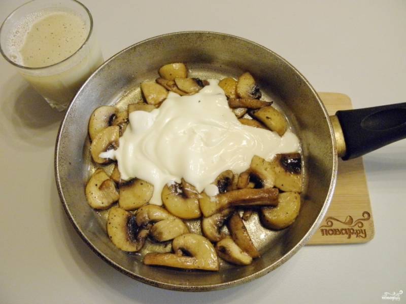 В стакане холодной воды растворите немного соли, добавьте перца и кукурузной муки, перемешайте, чтобы мука растворилась полностью и не образовала комочки. К почти готовым грибам добавьте сметану, воду с мукой и специями, перемешайте и тушите до загустевания соуса.