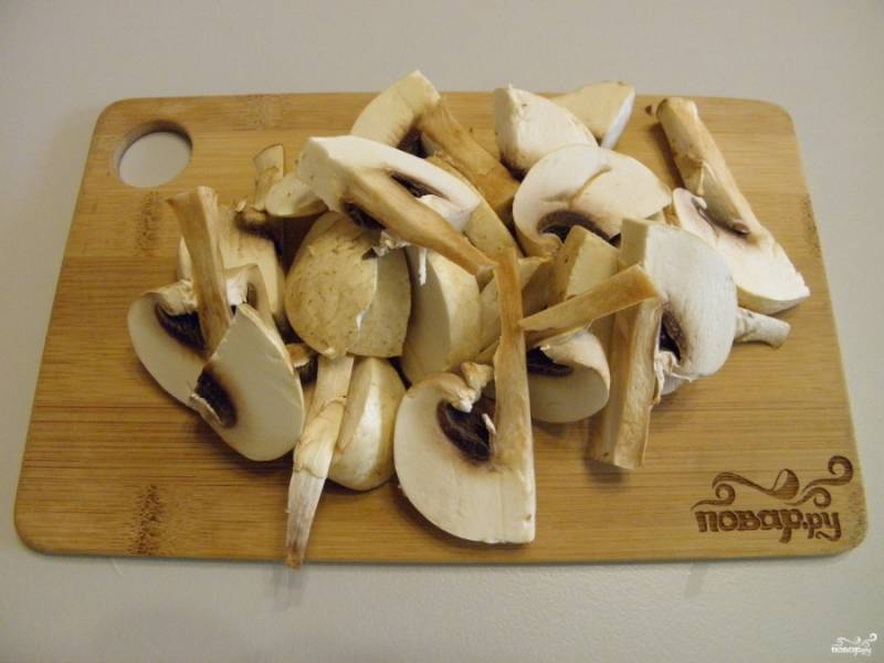 Теперь переходим к соусу. Грибы вымойте и порежьте небольшими кусочками, обжарьте их на растительном масле до мягкости.