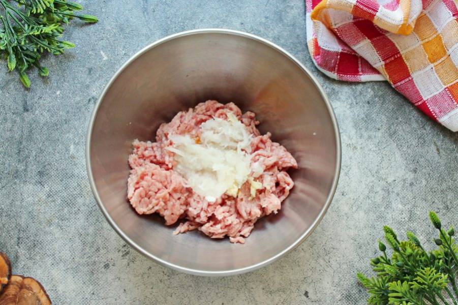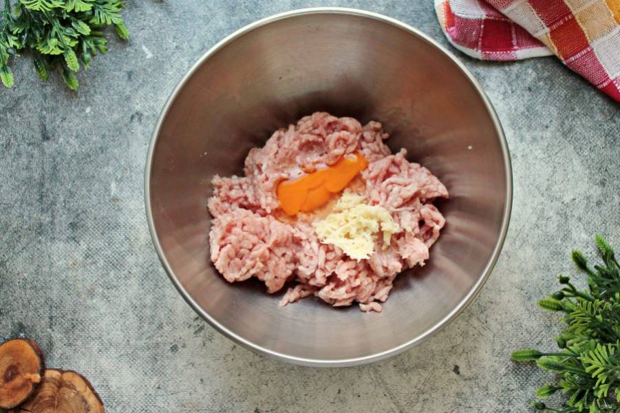 Чеснок измельчите и добавьте в фарш.