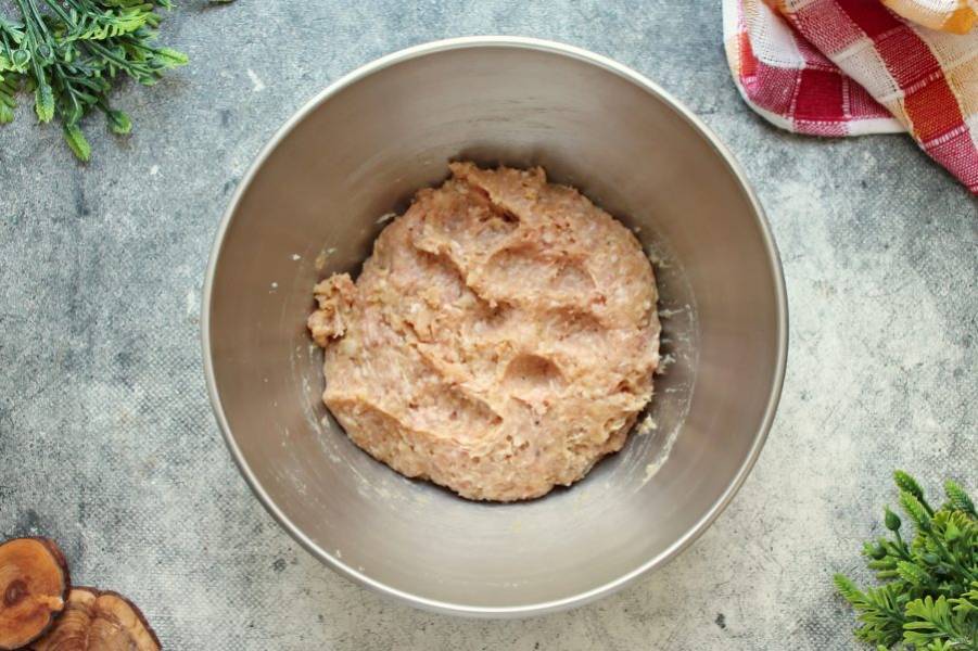 Все хорошо перемешайте и отбейте фарш до плотности. Для этого соберите фарш в руку, поднимите над миской и бросьте обратно. Сделайте так 10-15 раз.