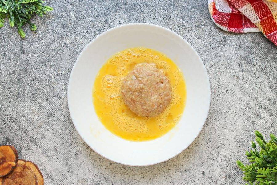 Разделите фарш на равные части и сформируйте круглые котлеты. Каждую котлету окуните в яичную массу.