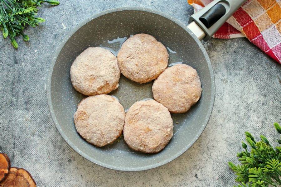 Выложите котлеты в яйцах в сухари и полностью запанируйте. В сковороде разогрейте растительное и сливочное масло, выложите котлеты.