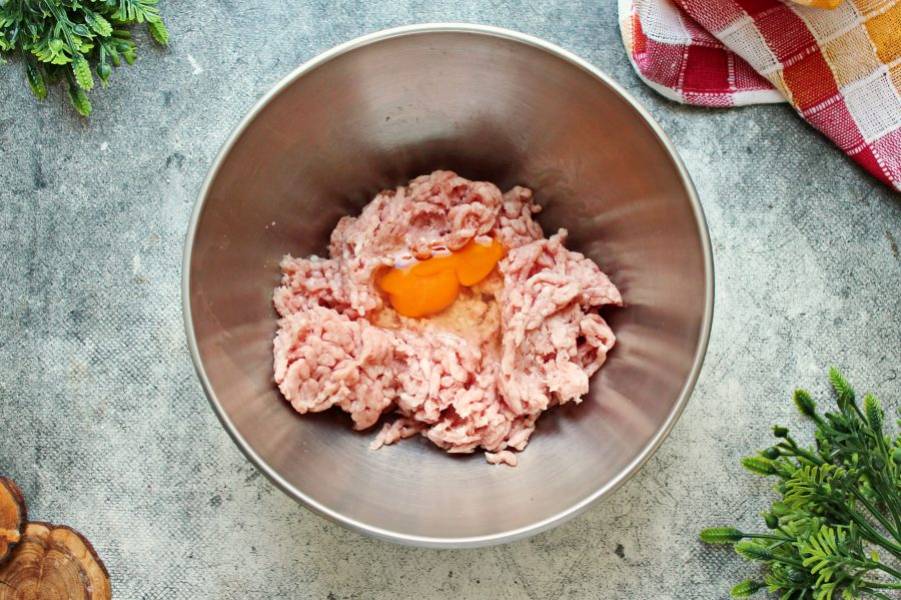 Фарш выложите в миску и вбейте одно яйцо.